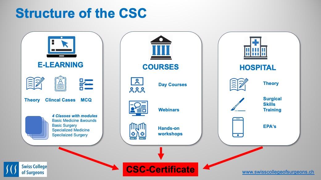 Die Weiterbildung für den Facharzt dauert aktuell in der Schweiz sechs Jahre und beinhaltet sowohl fachspezifische wie auch fachfremde Weiterbildungsjahre, die an verschiedenen Weiterbildungsstätten (WBS) absolviert werden können. Die allgemeine Weiterbildungs-Ordnung (WBO) gibt vor, dass während der Weiterbildung auch allgemeine Lernziele vermittelt werden. Das CSC beinhaltet nebst chirurgischen Basismodulen auch Elemente der allgemeinen Lernziele der ersten zwei Jahre nicht-fachspezifischer Weiterbildung. Alle im SCS organisierten Fachgesellschaften (Chirurgie, Gefässchirurgie, Handchirurgie, Kinderchirurgie und Thoraxchirurgie) bieten das CSC an und erkennen gegenseitig diese Weiterbildungsjahre an. Dies gibt angehenden Chirurg:innen mehr Spielraum in der Wahl der WBS der ersten zwei Jahren. Hat eine Absolvent:in des Eidgenössischen Examens in Humanmedizin sich bereits definitiv für einen Fachbereich entschieden, können je nach Vorgabe der Fachgesellschaften bereits zu Beginn ein oder zwei Jahre in diesem Fachgebiet absolviert und an die chirurgische Basisweiterbildungsjahre angerechnet werden.